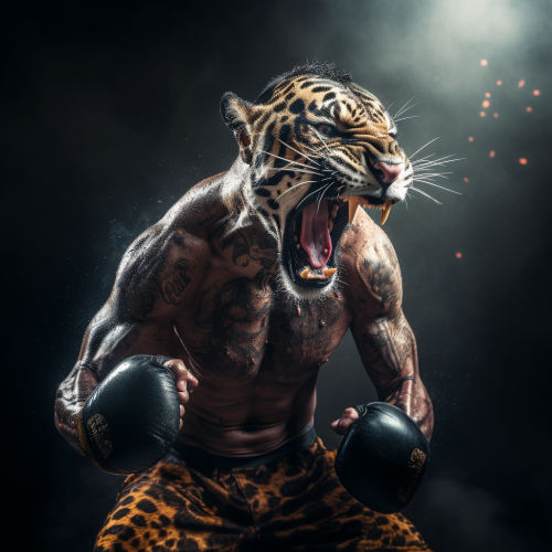 leopard muay thai fighter in the ring with shorts of a very fronidom and muscular fighter ready for the fight and defiant attitude --v 5.2