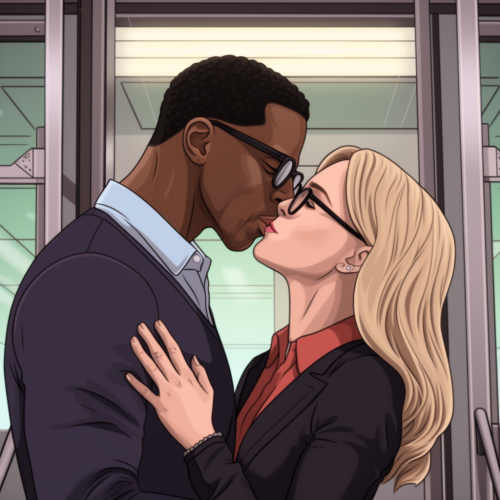 A hite curly-haired girl is kissing a man with very short hair and a very short beard on a loading dock. The two are hiding from the guards because they are trying to escape --s 250