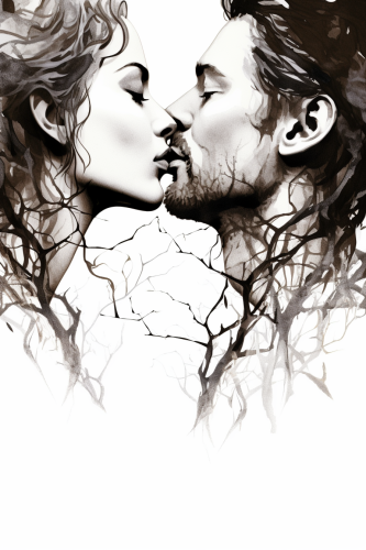 a black and white acrylic painting of a man and a woman kissing, silhouette, hair blowing in wind, dreadlocks, filigree, black background, wide brush strokes --ar 3:2