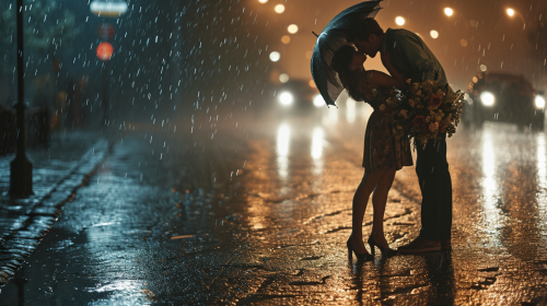 detailed, high photograph of A man and woman standing in the rain. The man is leaning over to kiss the woman while he holds a bunch of flowers behind his back. The woman leans into him with one leg bent at the knee, returning the kiss. --ar 16:9 --v 6.0