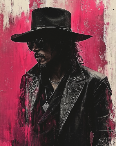 A primarily monochromatic image of Slash, in shades of pink color, highlighted with three vibrant accent colors; features rich textures like brushstrokes, grain, and embossing; the selective color accents draw focus to key areas; professional, engaging artwork with a uniquely sophisticated aesthetic --ar 4:5 --v 6.1 --q 2 --s 750