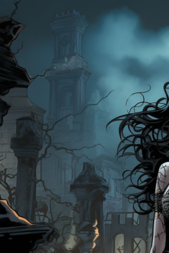 modern comic book page, Darkness Necromencer wearing hip hop style, with bone armor, looking at the cemetery, where people laying on the floor,She is wearing a black bandage strapless dress and a pearl necklace, with an elegant demeanor, high heels, stocking, fear and horror on her face, tired and beaten, an atmosphere of darkness and horror, dirty streets at night background, raw action shot, horror art, Symbolism, Graffuturism, Street Art Sculpture, enhance the details, sharpness, and contrast in post-production to get a hyper-realistic effect, fear scene, horror cinematic, highly detailed, extreme detail, horror cinematic scene, Photography Theme beautiful light, beautifully light color-coded, insane details, intricate details, beautifully color graded, Unreal Engine, Cinematic, Color Grading, Editorial Photography, Photography, Photoshoot, Super-Resolution, Megapixel, ProPhoto RGB, VR, Halfrear Lighting, Backlight, Natural Lighting, Incandescent, Optical Fiber, Moody Lighting, Cinematic Lighting, Soft Lighting, Volumetric, Contre-Jour, Beautiful Lighting, Accent Lighting, Global Illumination, Screen Space Global Illumination, Glowing, Shadows, Rough, Shimmering, Lumen Reflections, Screen Space Reflections, Diffraction Grading, Chromatic Aberration, GB Displacement, Post Processing, Post-Production, insanely detailed, hypermaximalist, elegant, hyper realistic, super detailed, photography, 64k, HDR, --ar 2:3 --v 5.2