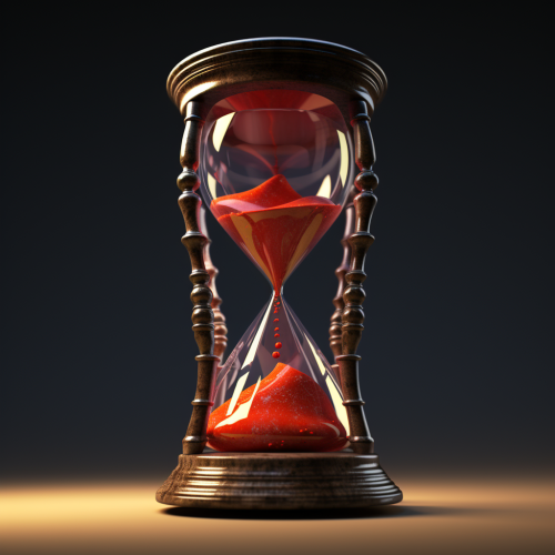 A majestic, oversized hourglass, with intricate celestial designs and golden shimmering sands, hovers against a gradient twilight-to-dawn sky. The top half is filled with sparkling stardust, while the sands transform into dynamic images of legendary basketball moments--dunks, clutch shots, and teamwork--flowing into a vibrant, illuminated basketball court below. Surrounding the hourglass are swirling, vibrant clouds in electric blues, fiery oranges, and energetic yellows, symbolizing dreams and aspirations. Motivational quotes about perseverance are subtly integrated into the design. Create a mesmerizing, uplifting, and highly detailed scene with a blend of realism and ethereal fantasy. --v 6.1 --stylize 500 --ar 2:3 --no logos or branding