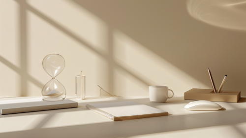 An hourglass filled with sand that trickles down from the top, representing time in the corporate world. As the sand flows, it forms images of a cityscape at the top (ambition) and a serene landscape at the bottom (integrity). Maya is depicted at the base of the hourglass, catching the sand in her hands, symbolizing her attempt to balance the two.--v 6.1 --ar 3:4
