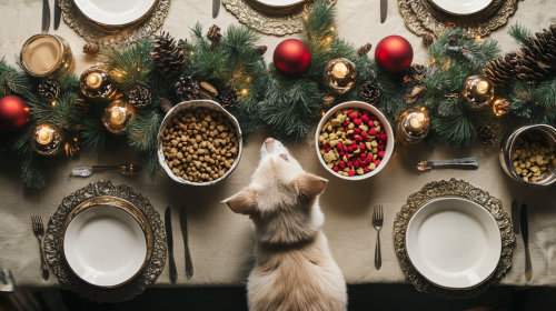 An elegant table. Served to celebrate the New Year. New Year decoration. With pet food bowls at each place. In the middle a banquet of pet food. Natural light. Magazine photo. Photo direction. Art direction. --ar 16:9