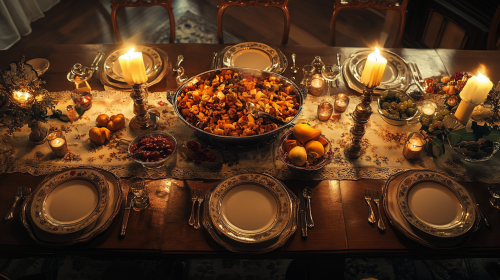 An elegant table. Served to celebrate the new year. With pet food dishes at each place. In the middle a banquet of pet food. Three flashlight sources. Natural light. Magazine photo. Photo direction. Art direction. --ar 16:9