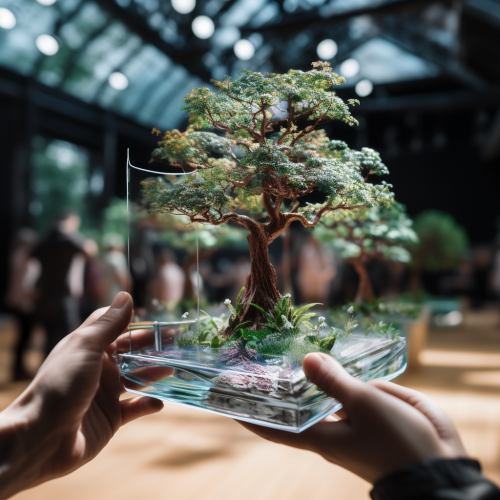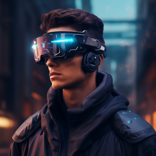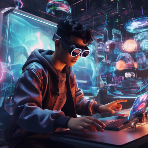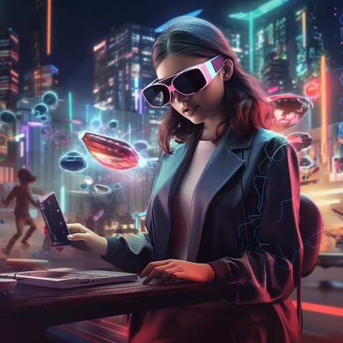 a hyper-realistic image of a person using AR while working with a nice futuristic vibrant background