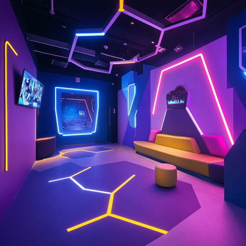 A zone in an entertainment exhibition called: Gamified Experiences: AR/VR Escape Rooms: Develop escape rooms using AR or VR technology that require participants to solve entertainment or event-themed puzzles. The zone theme should be characterized by a vibrant color palette, including fuchsia, blue, yellow, purple, and white, to enhance the visual impact and overall atmosphere. The zone should include Saudi people.