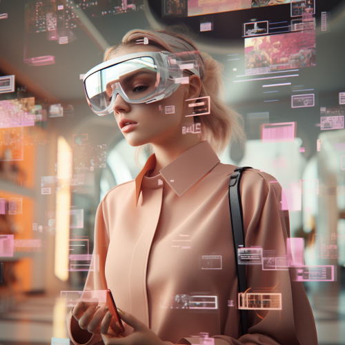 a cinematic, hyperealistic light pink view Augmented Reality Interface - Show a person wearing augmented reality (AR) glasses, with a holographic projection in front of them displaying various layers of information (like news, historical data, and real-time updates). This image conveys the blending of new knowledge into augmented experiences.