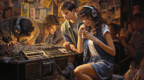 80s broadway musical, party scene, teen boy singing song called "Tune In Tokyo" to a girl, set comprised of images of tight sweaters and WWII radio parts --ar 16:9