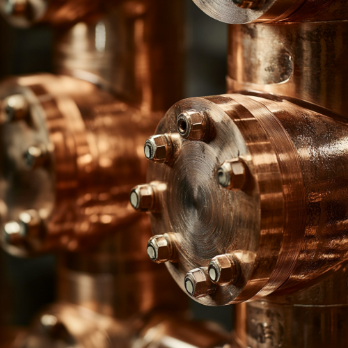 A close-up shot of industrial pipes and valves made from raw, unpolished copper, with natural patina and texture, under soft ambient lighting to highlight the rich metallic tones and rugged surface, captured with a Nikon Z7 II, macro lens, warm copper hues with subtle shadows