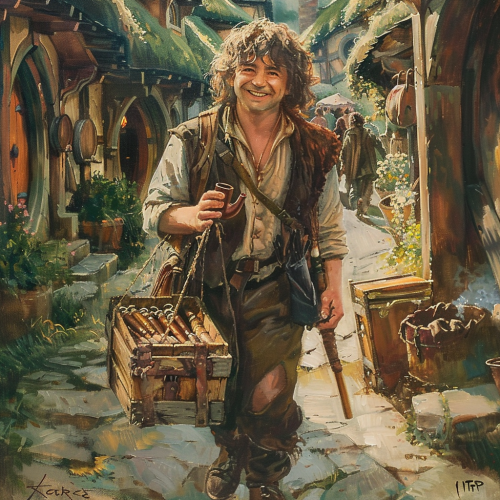 a lord of the rings, hobbit with a pipe and short curly hair, in hobbit clothes, carrying a crate full of pipes, happy, peaceful, smiling, in hobbiton, hobbits, in the streets of hobbiton, wide shot, portrait, full body, fantasy art oil painting --v 6.0