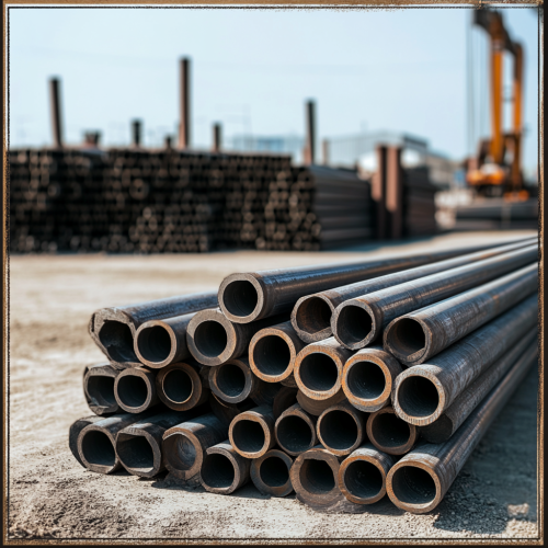 a square instagram post for a business that sells steel tubes and pipes, in the backlground is a yard stocked, there is design elements such as a footer and header for a logo