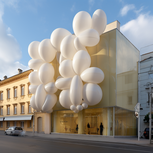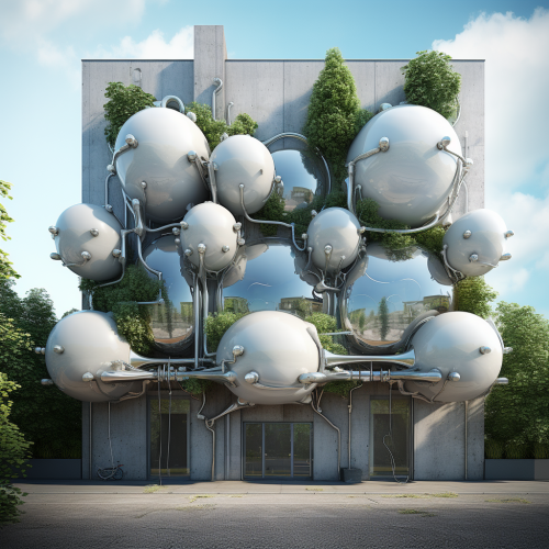 ballon tied with havc pipes facade almost bursting, architecture exterior with havc pipes, ready-made