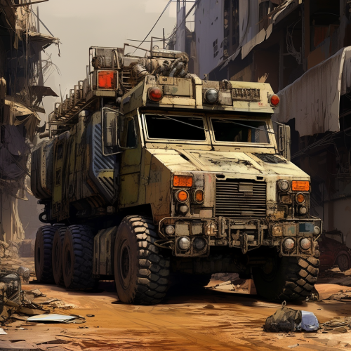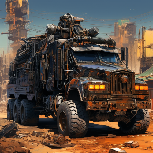 Grimdark futuristic post-apocalyptic wasteland industrial crowded infamous modified massive mobile truck fort, daytime, pollution, last survivors, fume pipes, radiator shields, artillery, sci-fi, very close-up view, digital art, masterpiece painting, ultra detailed, ultra high definition, 8K resolution, 3D shading, superior quality, cover illustration, complex design, earthly muted colours, hyperrealistic, meticulously hyper detailed, artstation