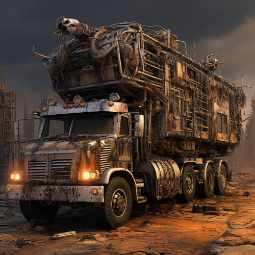 Grimdark futuristic post-apocalyptic wasteland industrial crowded infamous modified massive mobile truck fort, daytime, pollution, last survivors, fume pipes, radiator shields, sci-fi, very close-up view, digital art, masterpiece painting, ultra detailed, ultra high definition, 8K resolution, 3D shading, superior quality, cover illustration, complex design, earthly muted colours, hyperrealistic, meticulously hyper detailed, artstation