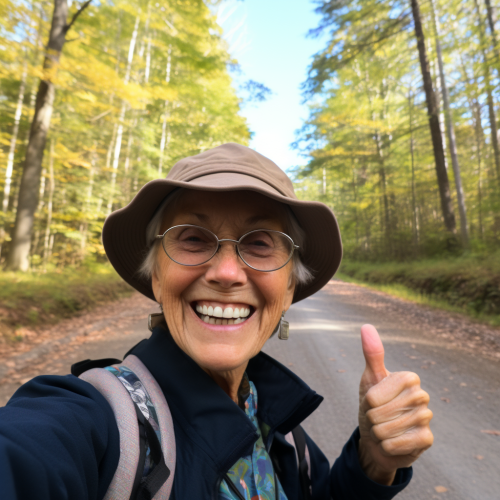A person standing confidently on a mountain peak after a hike, looking over a beautiful landscape, their expression serene, representing the reduction of anxiety and mental clarity from exercise.