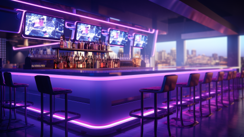 An image that represents the idea of a futuristic wine and spirits cellar. A window shows planets and galaxies --ar 16:9 --v 5.0