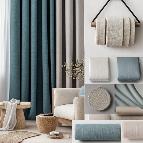 Design a cohesive interior design moodboard focused on layered window treatments. The moodboard should include: A color palette featuring teal, soft blue, warm beige, and light gray. Fabric swatches for sheer, blackout, and linen materials in complementary colors. Close-up textures of the fabrics to show detail. High-quality images of curtain hardware, such as matte black and brushed nickel rods, and minimalistic tiebacks. Decorative elements like natural wood accents and subtle plant details for added warmth and texture. Arrange all these elements in a clean, visually appealing, and organized layout that serves as an inspirational design guide.