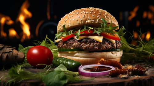 Cinematic, Commercial Photography, gorgeous hamburger with grill marks adorned with fresh herbs and a side of colourful vegetables, Depth of Field, high Contrast, ARRIFLEX 35 BL Camera, Canon K35 Prime Lenses --style raw --ar 16:9