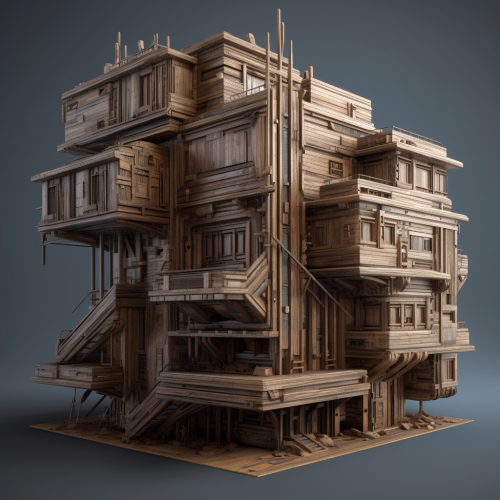 a wide shot of building with four levels with biomimicry architecture like in the image with multiple pools colums and plants and make the image a sketch with using color red to highlight parts of building, blue to highlight pools and green for plants