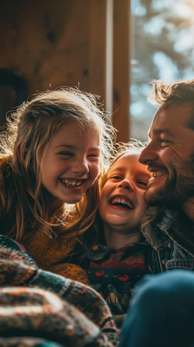 a father smiling at his two daughters, shot on IMAX Laser --ar 9:16 --v 6.0
