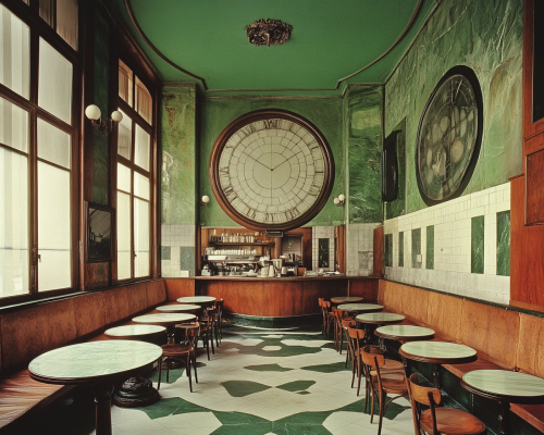 A nice cafe. A laptop working on a desk and a cup of coffee. A vibrant European city outside the window.::3 --aspect 16:9