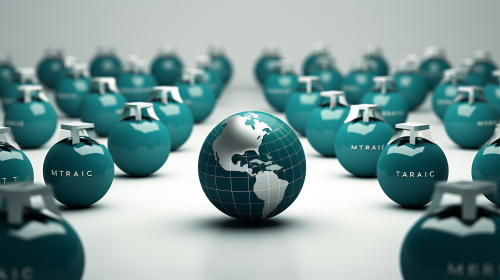 go-to-market strategy. global marketplace. concept. grey and dark teal colors. neutral white background --ar 16:9