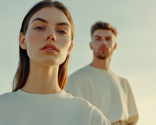 ditant shot of the image that exhibits a full body woman and man who appear to be dressed in elegant, white oversized t-shirts and beige trousers , this attire that suggests a sophisticated and possibly high-fashion context. The person in the foreground is wearing a white t-shirt too. Their facial expression is neutral yet intense, with forward-facing gaze and slightly parted lips, enhancing the serene yet commanding feel of the portrait. Slight shadows highlight the angles of the face, accentuating the strong bone structure. The second individual, placed slightly behind the first, echoes the attire with another white shirt that has a classic, crisp collar. Their expression and pose are similar, with a tranquil yet focused gaze, contributing to the overall sense of calm and poise in the image. The backdrop, which seems to be an outdoor setting with a pale sky and hints of a natural landscape, is subdued and softly out of focus. This ensures that the viewer's attention remains on the subjects themselves. Overall, the image conveys a sense of peaceful elegance with a focus on symmetry and minimalism. --ar 5:4 --stylize 50 --v 6.1