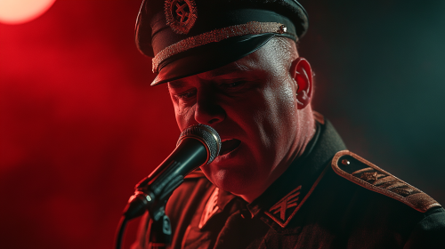 Singer/songwriter Jelly Roll in a WWII German Style uniform, Cinematic lighting, Unreal Engine 5, Cinematic, Color Grading, Editorial Photography, Photography, Photoshoot, Shot on 70mm lense, Depth of Field, DOF, Tilt Blur, Shutter Speed 1/1000, F/22, White Balance, 32k, Super-Resolution, Megapixel, ProPhoto RGB, Halfrear Lighting, Backlight, Natural Lighting, Incandescent, Optical Fiber, Moody Lighting, Cinematic Lighting, Studio Lighting, Soft Lighting, Volumetric, Contre-Jour, dark Lighting, Accent Lighting, Global Illumination, Screen Space Global Illumination, Ray Tracing Global Illumination, Red Rim light, cool color grading 45%, Optics, Scattering, Glowing, Shadows, Rough, Shimmering, Ray Tracing Reflections, Lumen Reflections, Screen Space Reflections, Diffraction Grading, Chromatic Aberration, GB Displacement, Scan Lines, Ray Traced, Ray Tracing Ambient Occlusion, Anti-Aliasing, FKAA, TXAA, RTX, SSAO, Shaders, OpenGL-Shaders, GLSL-Shaders, Post Processing, Post-Production, Cel Shading, Tone Mapping, CGI, VFX, SFX, insanely detailed and intricate, hypermaximalist, elegant, hyper realistic, super detailed, dynamic pose, rain, night, dim light --ar 16:9