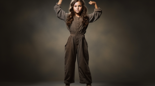 t-pose of a muddy 1940’s British farm girl aged 11, dark hair, serious expression, symmetrical, full body, spread arms, grey background, historic WWII movie character, front view --ar 16:9 --style raw --v 5.2