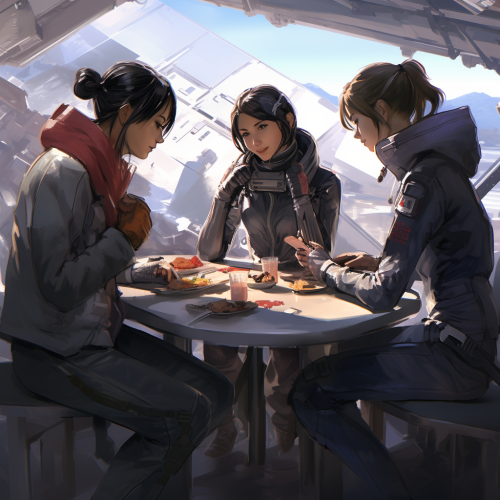Concept art, 5 female pilots who look like they appear in Gundam, obsessed with food, Liberation Army campsite, fun conversation, daytime, Final Fantasy style, UE5
