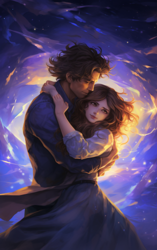 anime scene a man holding a woman in an overhead lift pose. she has long golden brown hair and yellow eyes. he has dark wavy hair and blue eyes, swirling portal of purple light above them, --ar 5:8