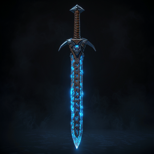 A longsword. Full View. The hilt is wrapped in leather. There are blue glowing runes on the blade. Fantasy Concept Art. 8k Resolution. Photo Realistic. Extremely Detailed. --v 6.0