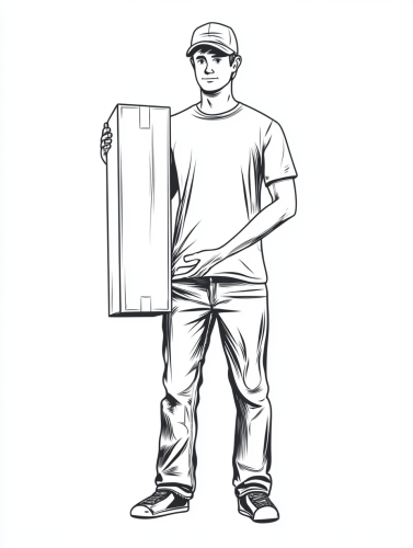 a man wearing baseball hat, t-shirt and jeans standing and holding a slim rectangular shipping box in one hand and in the other hand he is carrying a laptop. isolated on white background, black and white line drawing style. --ar 4:3