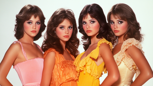 1970s a photorealistic cast promotional image for a reality TV show about a prom dress stores, with the female teen models of the store, wearing short prom dresses, super cute faces and hair styles. Three white, one latina. White background. --ar 16:9 --v 6.1
