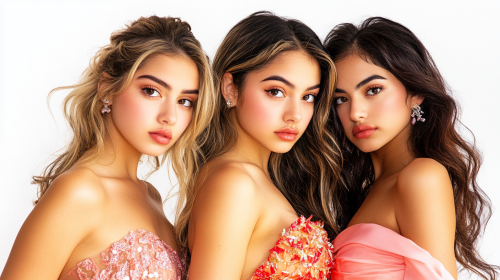 a photorealistic cast promotional image for a reality TV show about a prom dress stores, with the female teen models of the store, super cute faces and hair styles. Three white, one latina. White background. --ar 16:9 --v 6.1