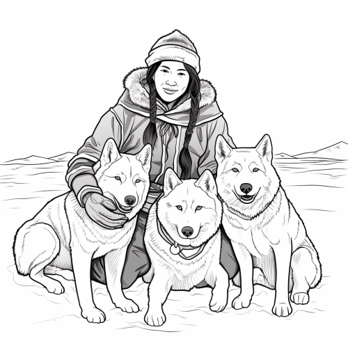 coloring book, inuit with husky dogs, no color, no shadows, simple illustration, no background