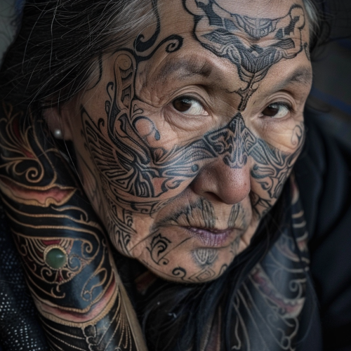 A realistic image of a lean, elderly Inuit man with wispy hair and a mustache wearing traditional summer robes with dark blue, green, pink and purple colors crouching next to an albino alligator with his hands clasped --ar 2:1