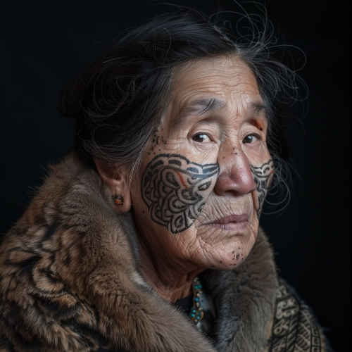 A realistic superhero drawing of Nerrivik an Inuit goddess of the sea and marine animals, with flowing hair and a peaceful face, wearing a parka made from feathers and sealskin fur, , holding a Whale bone, Seashells, in the landscape of the arctic sea --ar 2:3