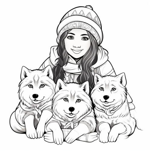 coloring book, inuit girl with husky dogs, no color, no shadows, simple handdrawn illustration, no background