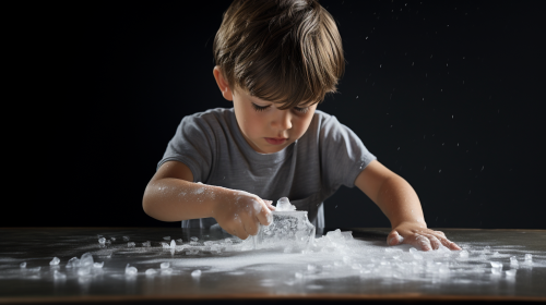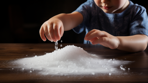 kid sprinkling a small amount of table salt from above onto a piece of white paper, photography --ar 16:9