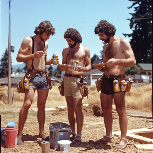a photograph of a three men in the late 1970s who are present at a deck construction project. it is a hot summer's day in the Pacific North West. they are wearing athletic shorts and an athletic shirt. they have multiple cans of Victoria Bitter beer attached to their tool belt. they are each engaged with their iPhones. --s 50
