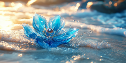 Photo-realistic 8K fairy tale of a detailed floating blue oceanflower with a shiny pearl inside on the art nouveau flaming sun beach of goa by the indian ocean, close-up picture of white sands and wiping palms in front of an interstellar wave pattern,the ocean is splashing in shallow waters,dreamy with a classical art nouveau touch in a cosmic opera,supernova out of the universe into a goa trance scenery,magical atmosphere with stardust trickles down the cosmic pearl in the giant clam,sharp focus, professional photography, best quality, cinematic angle, high-end. --ar 2:1 --v 6.1