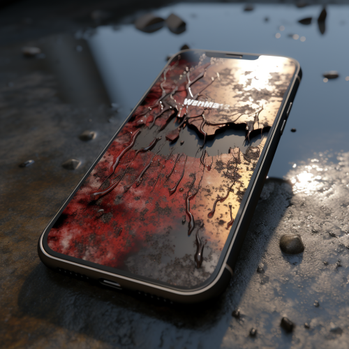 a down of iphone 15 pro era, rotten iphone, beaten iphone, ultrarealistic render, front view ar 16:9