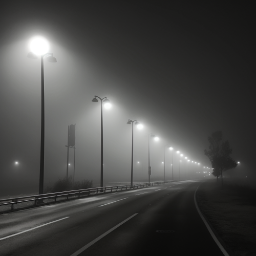 [bb6ae5234] The highway streetlights in black and white thin fog. A photo taken by an iPhone 14 pro,Low saturation --ar 1:1 --v 5.2 --s 50 --style raw
