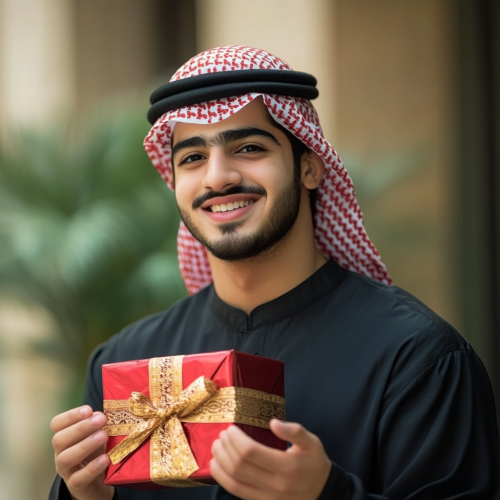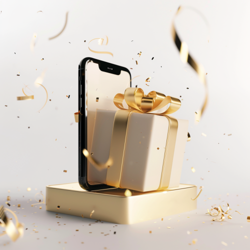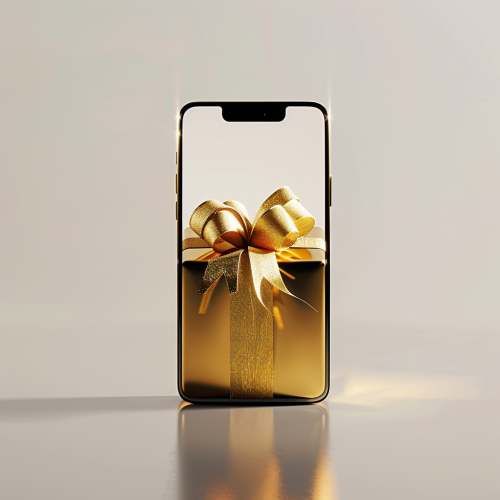 A gift box is coming out of your iPhone 15's screen and into the real world. The gift box is wrapped in beautiful gold ribbon. Bright and warm cinematic lighting. white minimal background. Shot with a commercial camera. --v 6.0