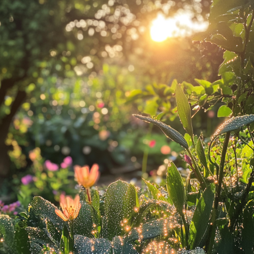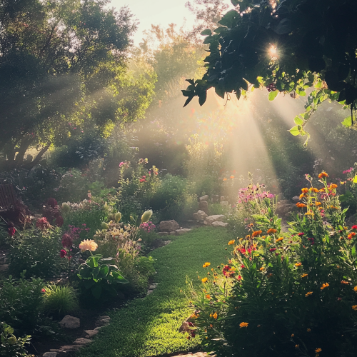 Morning light illuminating a lush garden filled with blooming flowers, soft rays highlighting the beauty and tranquility of the early day. Taken with an iphone 15 pro