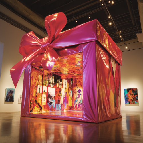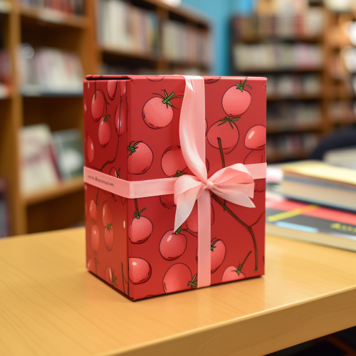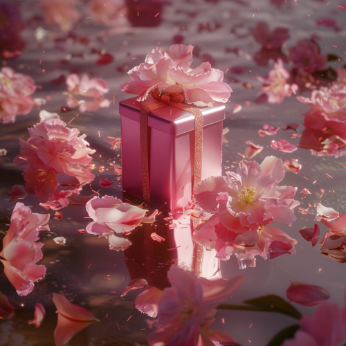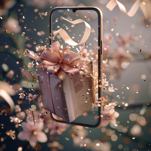 A gift box pops out of the iPhone 15's screen and into reality. The gift box is wrapped in beautiful blossoming ribbon. Bright and warm cinematic lighting. Shot with a commercial camera. --v 6.0