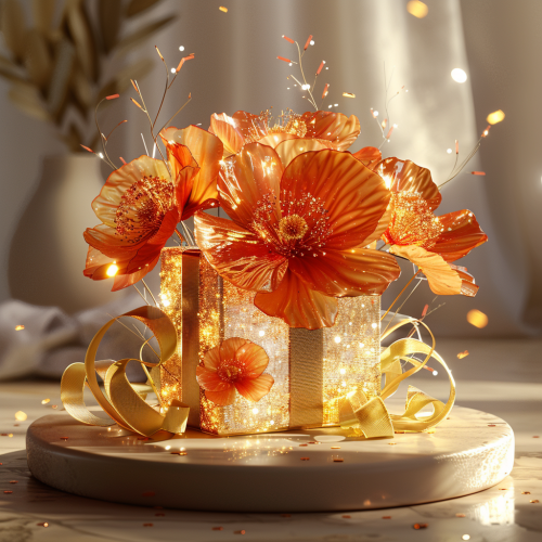 A gift box pops out of the screen of your iPhone 15 into reality, wrapped in a gold ribbon. The ribbon is shaped like a poppy flower. Bright, warm cinematic lighting illuminates the gift box and its surroundings. Set a minimalist background with white tones. Shot with a commercial camera shooting a commercial commercial. --v 6.0 --s 250